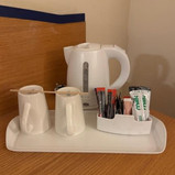 A miniature white kettle that looks like it came free with a doll’s house, complete with a grimy interior. Served with plain mugs, plain tray, plain coffee — no biscuits. The fridge? A concept they’ve clearly heard of but not embraced.
