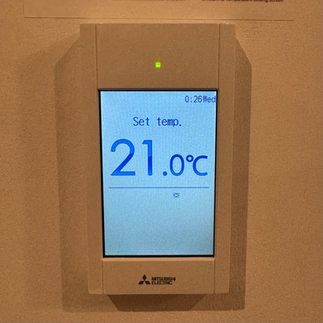 Aircon: A Mitsubishi control panel on the wall — actually worked.